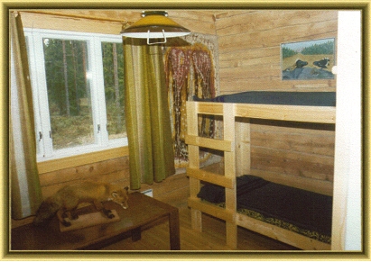 Näkymä makuuhuoneesta. Huoneessa on kaksi kerrossänkyä. Kuva J Inkinen